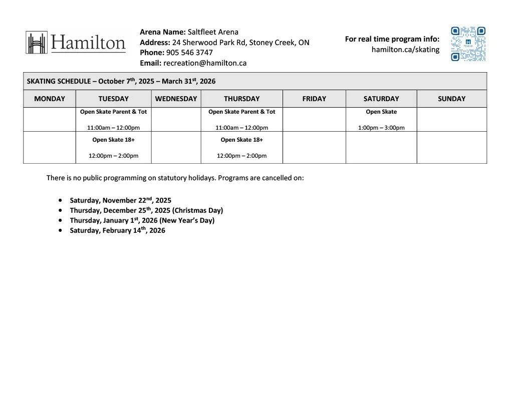 Located at 24 Sherwood Park Road in Stoney Creek, Saltfleet Arena offers Open Skate programming throughout the Winter season.
